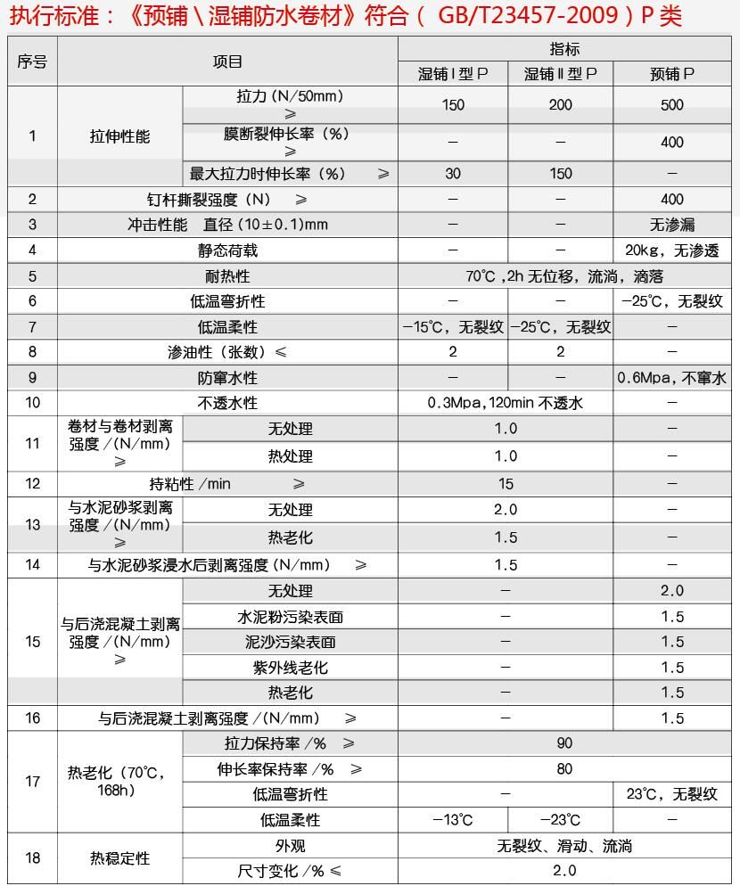 ●抗冲击和耐穿刺性能优异.能承受施工荷载及钢筋的冲击.预铺反粘施工时不需要格外的保护.可直接进行混凝土浇筑。